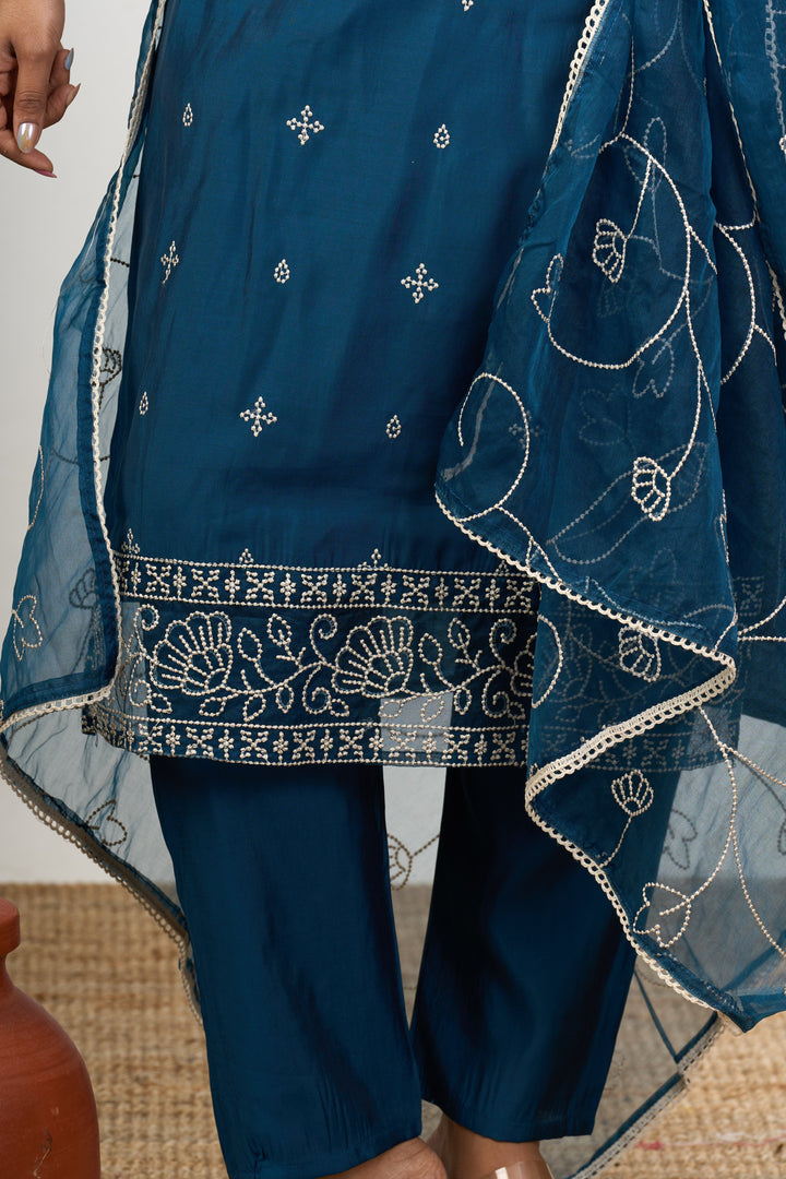 Update your festive wardrobe with this elegant latest function wear dress. Designed in rich teal blue blend silk, this straight suit set features fine white embroidery, carefully placed along the neckline and dupatta for a sophisticated finish. The sheer dupatta, adorned with intricate floral motifs and scalloped edges, perfectly complements the straight-cut kurta. Crafted for both style and comfort, this outfit brings a contemporary yet traditional appeal to any festive function. Whether it’s for Lohri, Diwali, or a cultural celebration, this suit set ensures a graceful look that’s sure to turn heads.