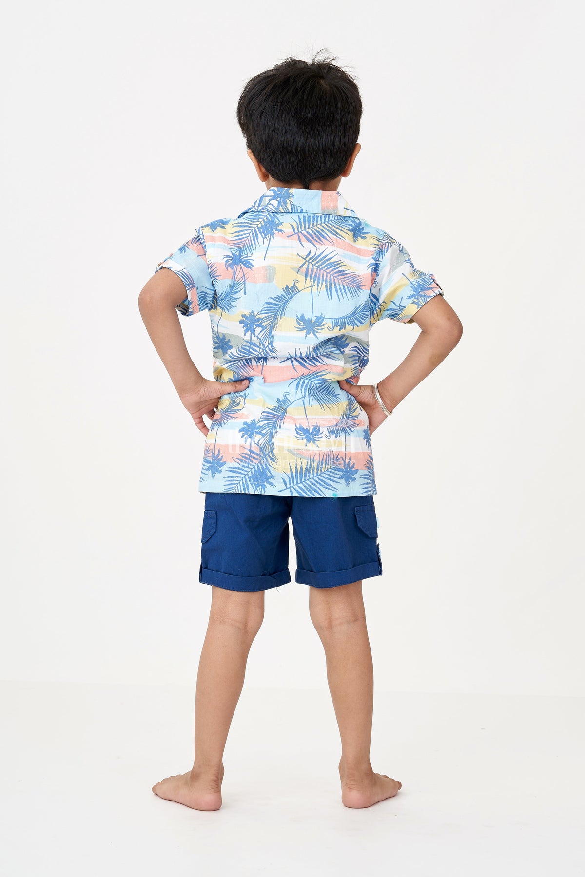 Designed for adventurous summer days, this vibrant casual dress mens outfits inspired set for boys brings together fun prints and all-day comfort. The set includes a multicolor tropical digital print shirt with button detailing, a soft cotton graphic sleeveless tee with inspirational text, and navy blue shorts with functional pockets and button accents. Made from breathable cotton with digital print, it’s perfect for casual hangouts, holidays, or playdates. Your little one can enjoy comfort without compromising on playful style in this trendy three-piece outfit.